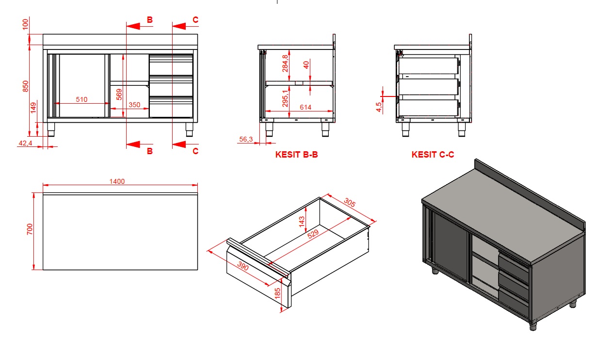 700 WERKTAFEL SCHUIFDEUREN LADEN RECHTS MET RAND 1400
