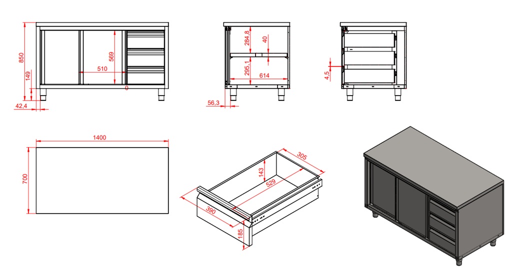 700 WERKTAFEL SCHUIFDEUREN LADEN RECHTS 1400