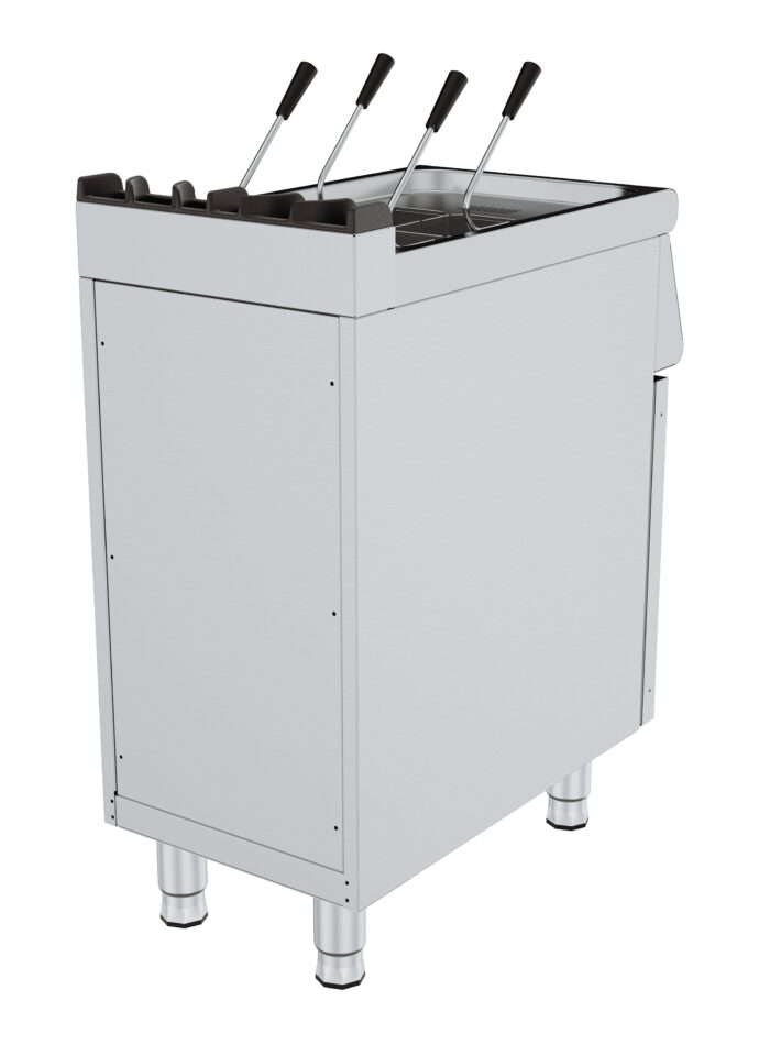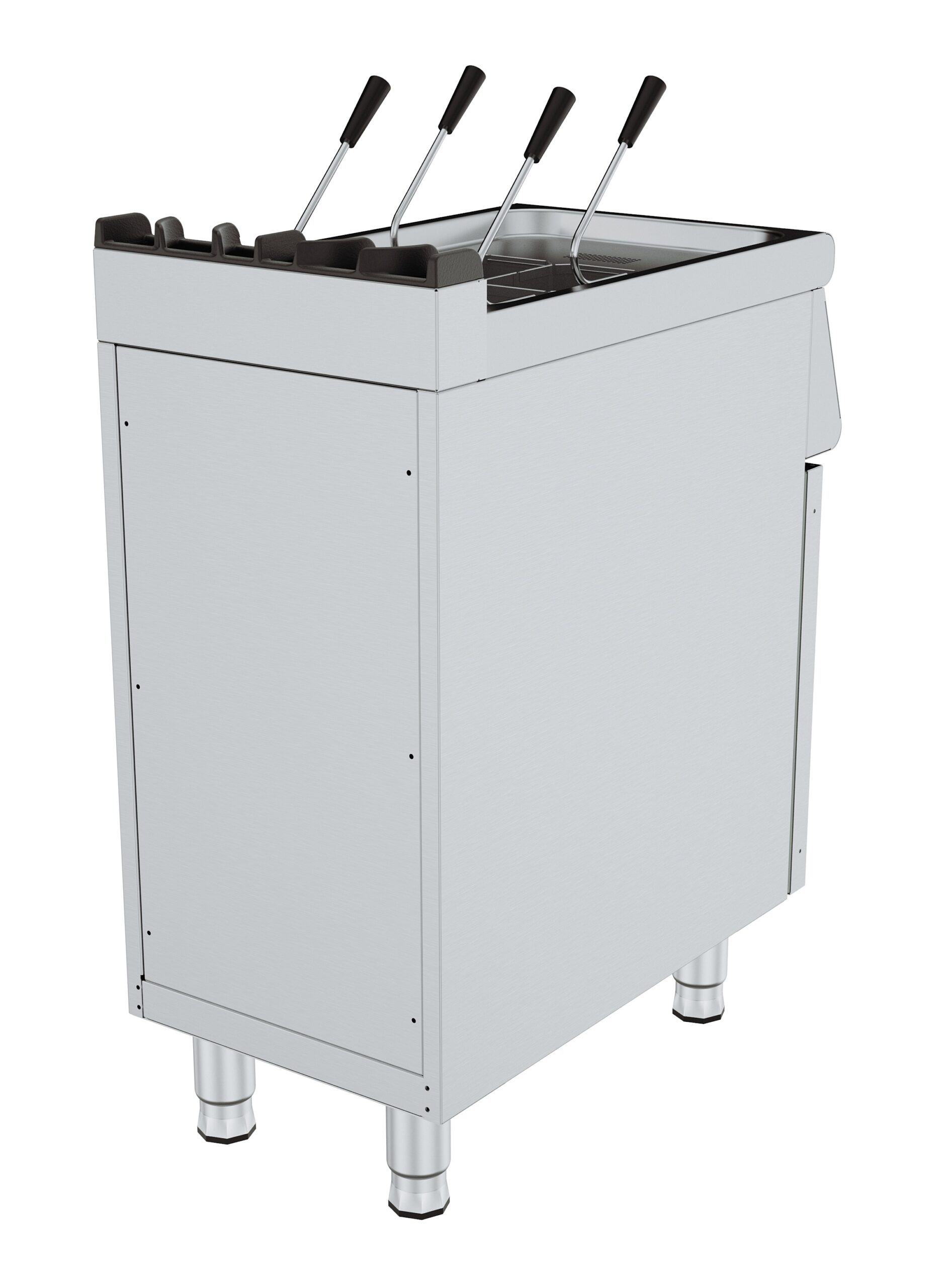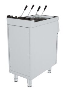 Deze hoogwaardige pastakoker is perfect voor het snel en eenvoudig bereiden van heerlijke pasta. Dankzij zijn robuuste ontwerp is hij geschikt voor intensief gebruik in professionele keukens, van restaurants tot grootkeukens en cateringbedrijven. De duurzame RVS behuizing zorgt voor een lange levensduur en is eenvoudig te reinigen. De krachtige gasbranders zorgen voor een snelle opwarming en een efficiënte bereiding van pasta. Met een nauwkeurige regeling van de watertemperatuur is deze pastakoker ontworpen voor optimaal gebruiksgemak en maximale prestaties. Afmetingen: 400x700x900 mm (LxPxH) – verbruik: 10,5 kW – temperatuur: 0-120°C – inhoud: 18 liter – gewicht: 74 kg.