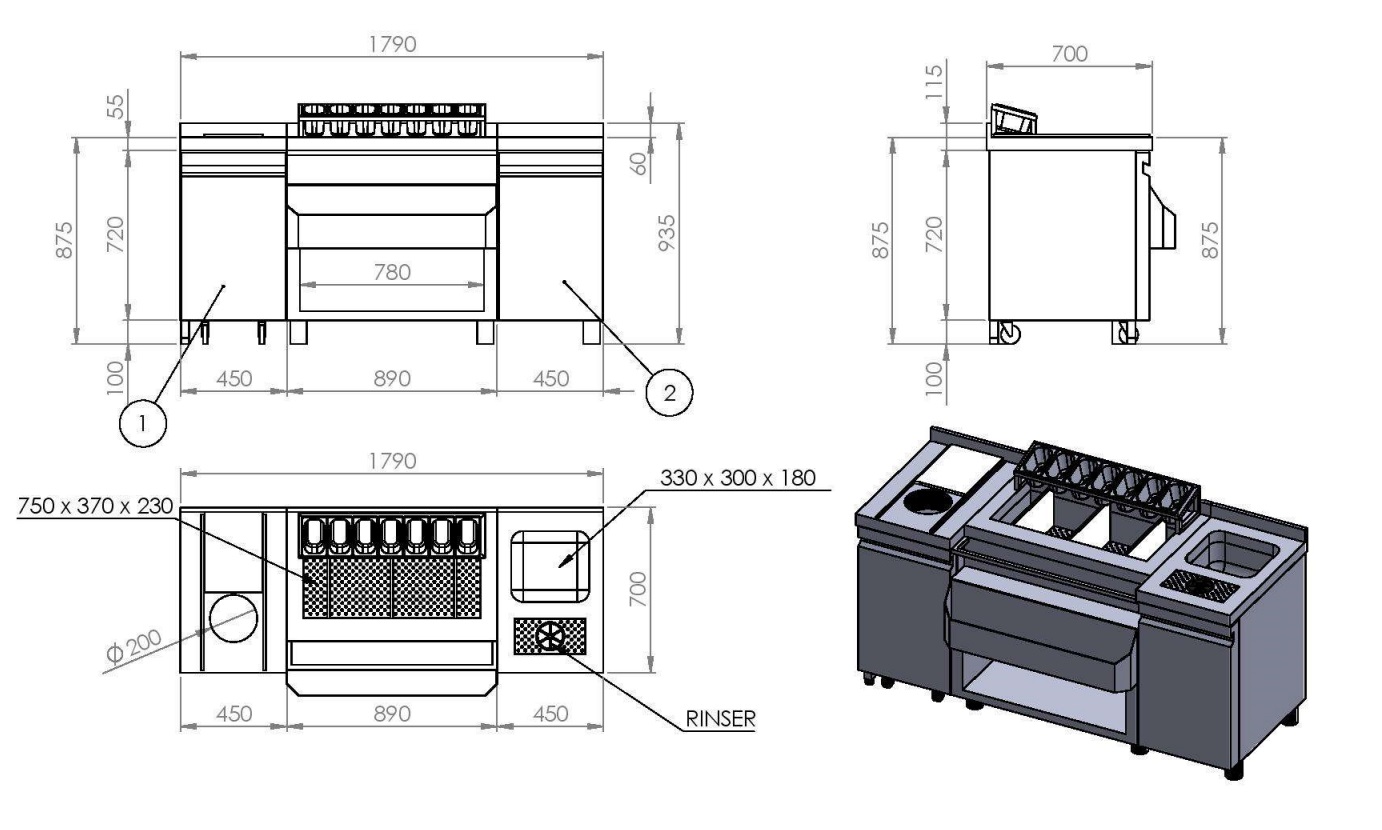 COCKTAIL BAR STATION INCL. SPOELBAK, GLAZENSPOELER, GN-BAKKEN, SPEEDRAIL VOOR FLESSEN, SNIJPLANK EN AFVALBAK