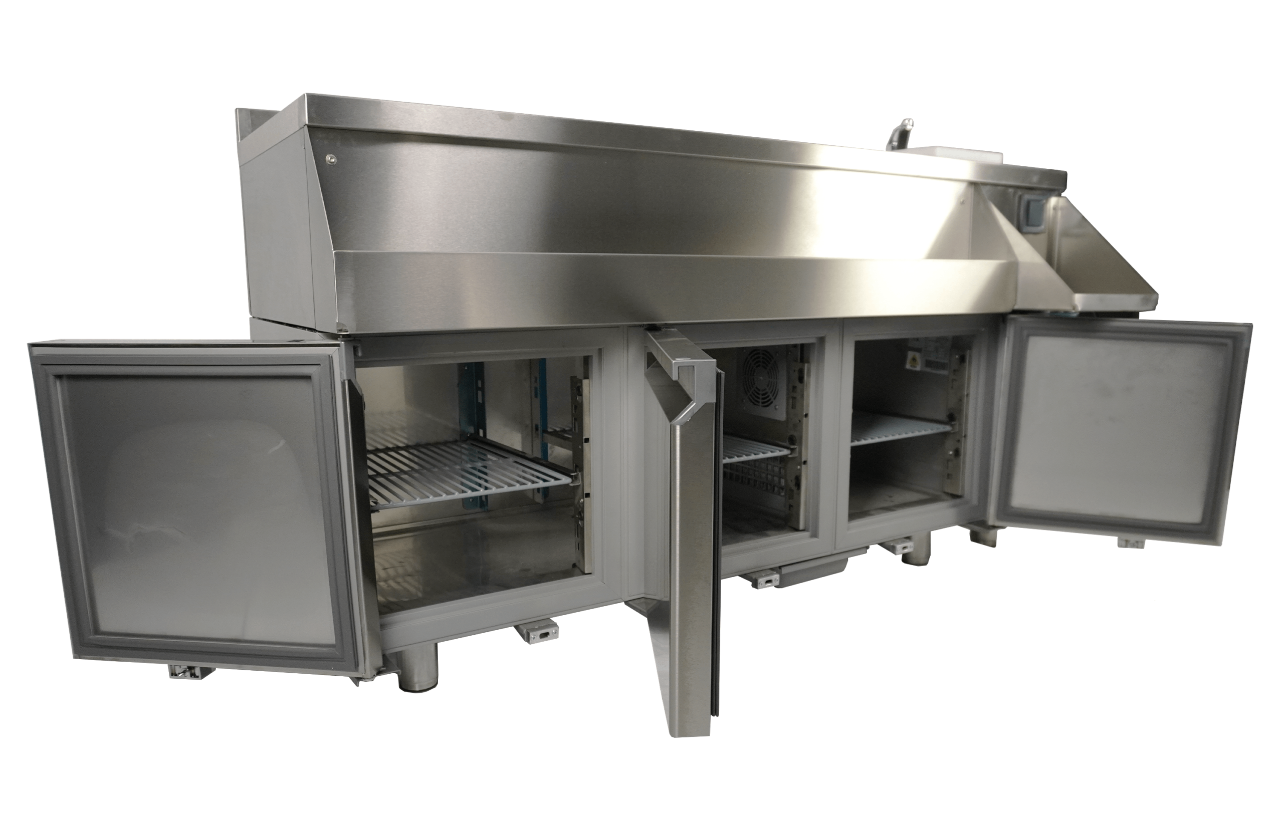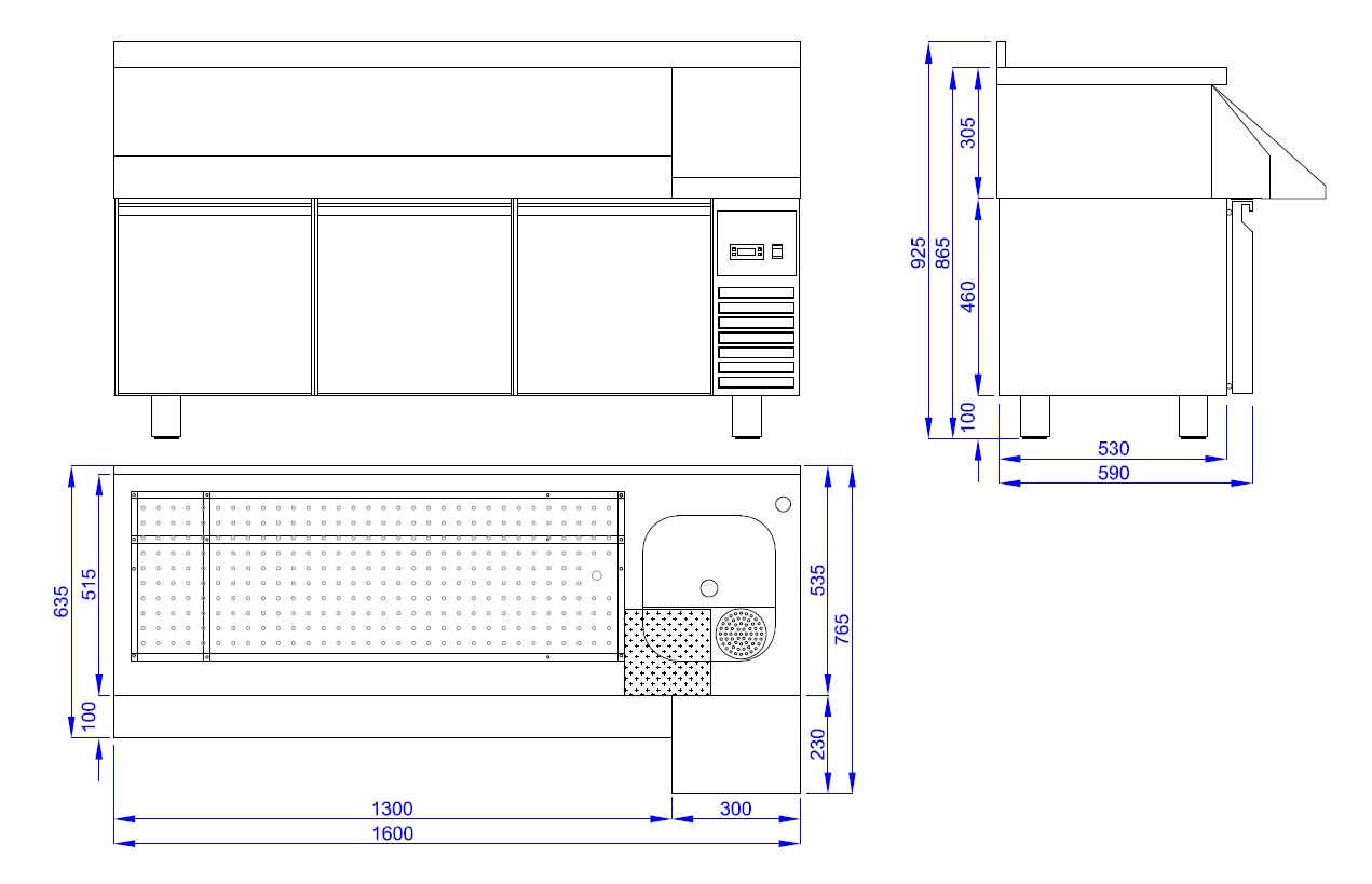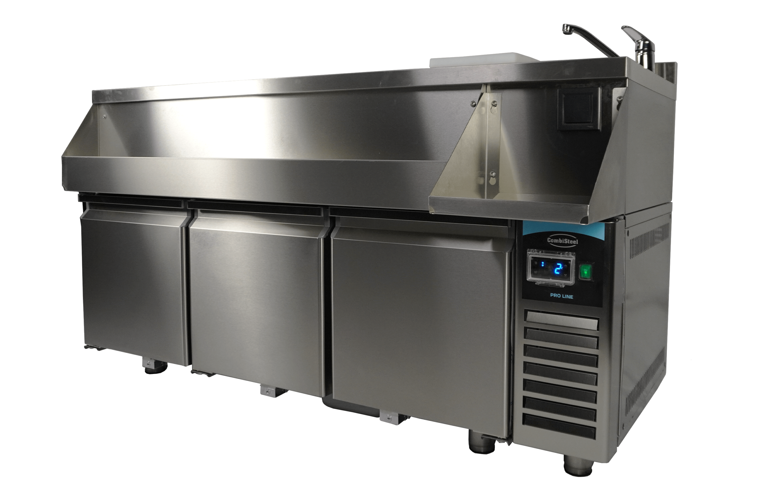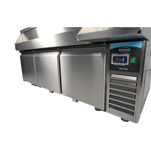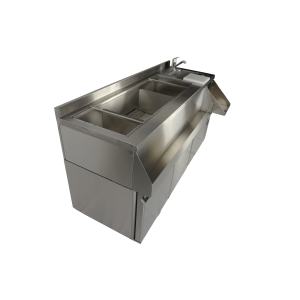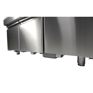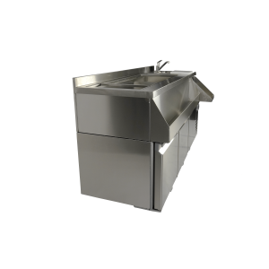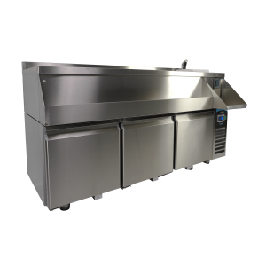 De gekoelde cocktail bar station met 3 deuren is ideaal voor professionele bartenders en biedt alles wat je nodig hebt voor het bereiden van de perfecte cocktails. Aan de voorzijde bevindt zich een handige ‘speedrail’ voor snelle toegang tot flessen, en een schap biedt ruimte voor een blender. Daarnaast wordt het station geleverd met een kraan, spoelbak, glazenspoeler, snijplank en stopcontact bij het schap voor het aansluiten van de blender. Het geventileerde koelsysteem zorgt voor efficiënte koeling, terwijl automatische ontdooiing het onderhoud minimaliseert. De afmetingen zijn 1600x760x1000 mm (LxDxH) – verbruik 0.32 kW – inhoud 280 liter – temp. +2/+8ºC – gewicht 125 kg.