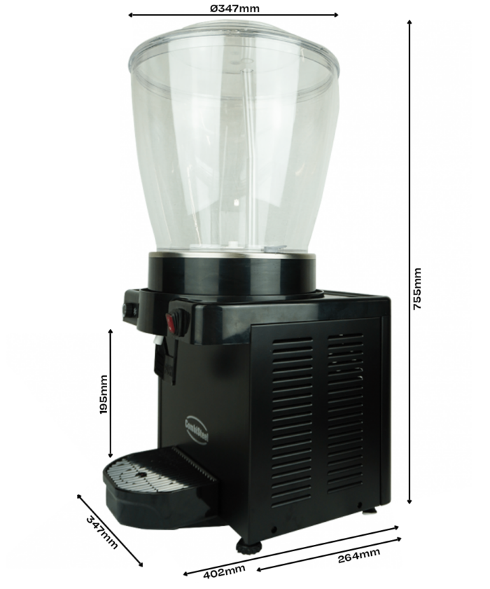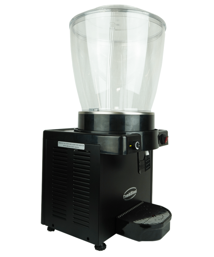 Deze zwarte Combisteel drankendispenser is perfect voor elke gelegenheid waarbij je gekoelde frisheid wilt serveren: van ontbijtservice en lunchbuffetten tot evenementen of zelfbediening in cafés en hotels. Dankzij de royale capaciteit van 22 liter kunnen grote hoeveelheden drank eenvoudig worden gekoeld en uitgeschonken. De dispenser is handmatig te bedienen en voorzien van een handige lekbak, zodat je werkblad netjes blijft. Afmetingen: 350x405x752 mm (LxDxH) – verbruik: 0,5 kW – temp. +3/+10ºC – gewicht: 22 kg.