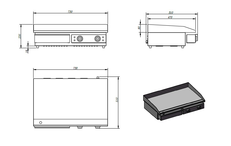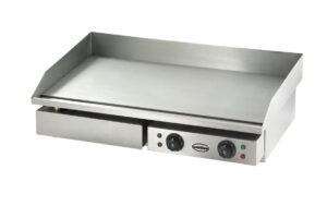 Deze compacte tafelmodel bakplaat is ideaal voor zowel thuisgebruik als kleinere professionele keukens. Met de twee instelbare thermostaten kun je elke zone onafhankelijk van elkaar aanpassen, wat zorgt voor ultieme flexibiliteit en efficiëntie. De gelijkmatige warmteverdeling garandeert een perfecte bereiding van al je gerechten. De robuuste RVS behuizing en de uitneembare olieopvangbak maken het schoonmaken eenvoudig en snel. De afmetingen zijn 730x510x230 mm (LxDxH) – verbruik 3.5 kW – gewicht 28.5 kg.