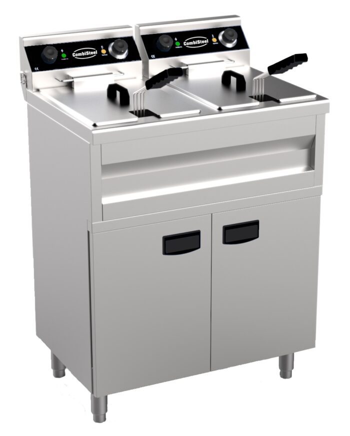Deze elektrische friteuse met twee afzonderlijke 9-liter bakken is ideaal voor professionele keukens die flexibiliteit, capaciteit en efficiëntie nodig hebben. Dankzij het dubbele systeem kan elk compartiment apart worden bediend – perfect voor het tegelijk frituren van verschillende producten of het gescheiden houden van oliën. De friteuse is volledig vervaardigd uit roestvrij staal en uitgerust met twee frituurmanden inclusief deksels, twee deuren voor handige opbergruimte en een aftapkraan voor het makkelijk legen van de vetbakken. De speciaal ontworpen koude zone laat kruimels en resten naar de bodem zakken, waardoor de kwaliteit van het vet behouden blijft en de levensduur ervan aanzienlijk wordt verlengd. Afmetingen: 695x530x970 mm (BxDxH) – Spanning: 2x 230V – Vermogen: 2x 3,3 kW – Inhoud: 2x 9 liter – Gewicht: 49 kg