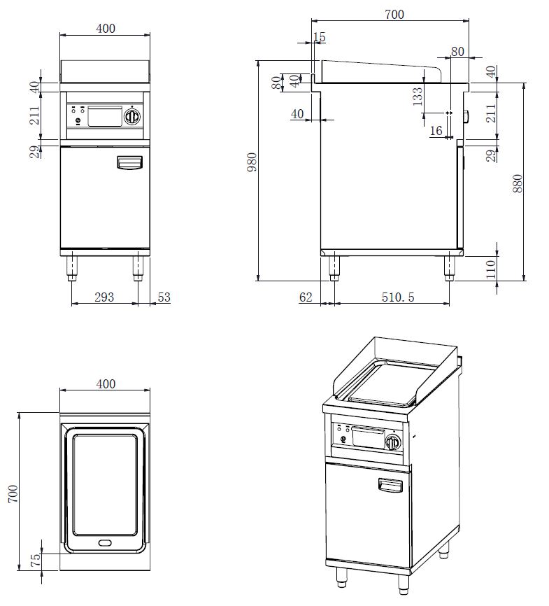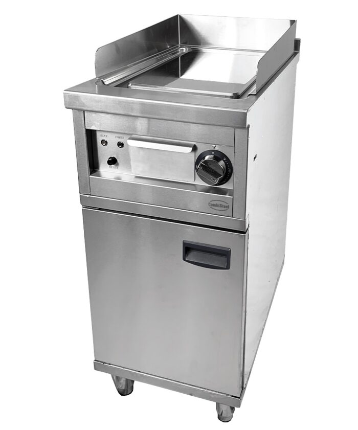 De Combisteel Entry Line 700 bakplaat is de ideale aanvulling op jouw elektrische kooklijn. Met een robuuste RVS behuizing en een verchroomd, glad bakoppervlak van 282×447 mm combineert deze bakplaat duurzaamheid met eenvoudige reiniging. Dankzij het vermogen van 2,7 kW levert hij snelle, gelijkmatige warmte voor perfecte resultaten – en dat op een energiezuinige manier. De bakplaat is uitgerust met een aan/uit schakelaar en gebruiksvriendelijke draaiknop, waarmee je de temperatuur nauwkeurig regelt. De geïntegreerde vetopvangbak zorgt voor hygiënisch en schoon werken. Afmetingen: 400x700x980 mm (BxDxH) – Spanning: 400V – Vermogen: 2,7 kW – Temp. bereik: +180/+250°C – Gewicht: 44 kg.