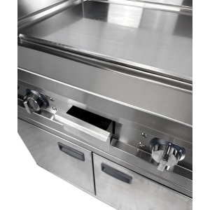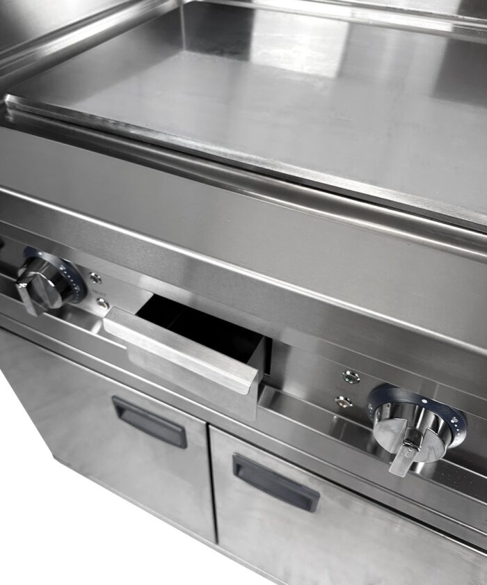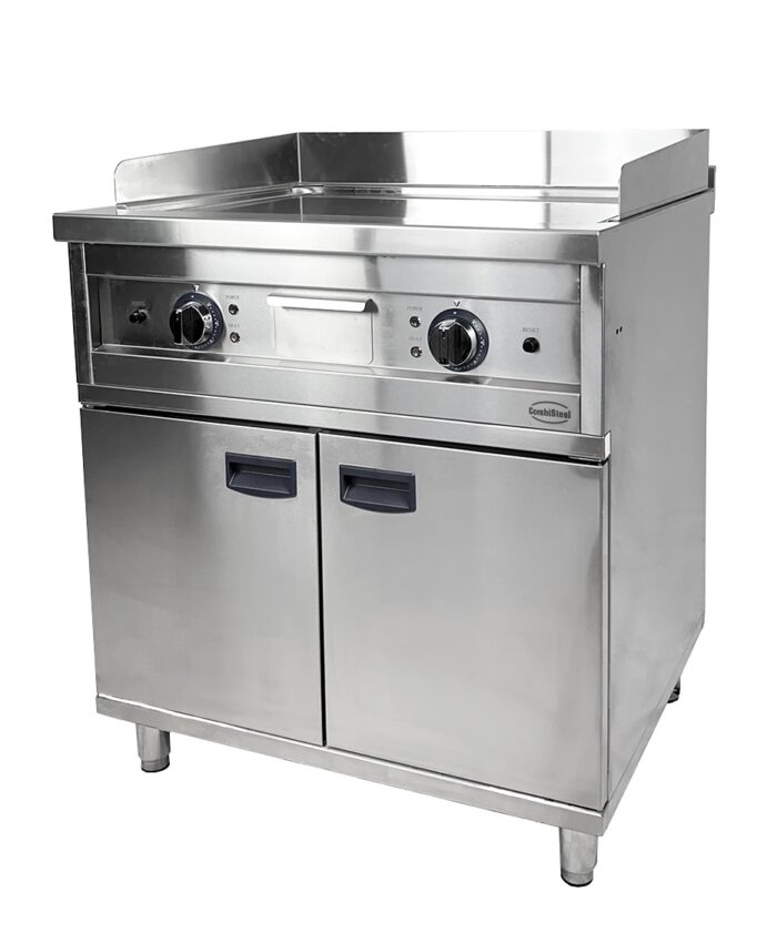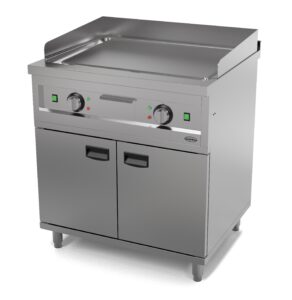 De Combisteel Entry Line 700 dubbele bakplaat is de ideale uitbreiding van jouw elektrische kooklijn. Met een robuuste RVS behuizing, verchroomd glad bakoppervlak en afneembare spatrand combineert deze bakplaat duurzaamheid met eenvoudige reiniging. Dankzij het totale vermogen van 8,1 kW levert hij snelle, gelijkmatige warmte voor perfecte resultaten – en dat op een energiezuinige manier. De bakplaat is uitgerust met twee aan/uit schakelaars en twee draaiknoppen, waarmee je de temperatuur van beide zones nauwkeurig regelt. De geïntegreerde vetopvangbak zorgt voor hygiënisch en schoon werken. Afmetingen: 800x700x980 mm (BxDxH) – Spanning: 400V – Vermogen: 8,1 kW – Temp. bereik: +180/+250°C – Gewicht: 85 kg.