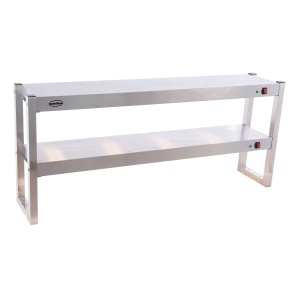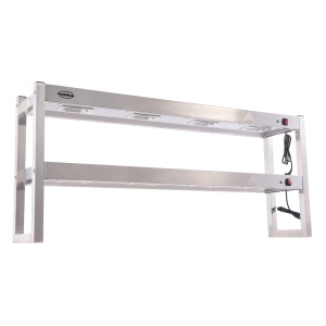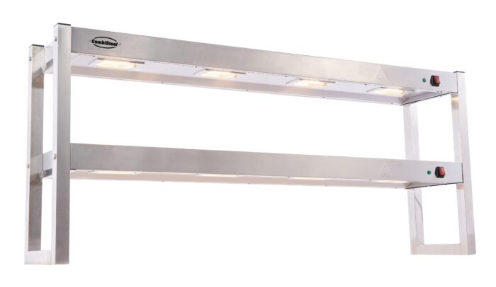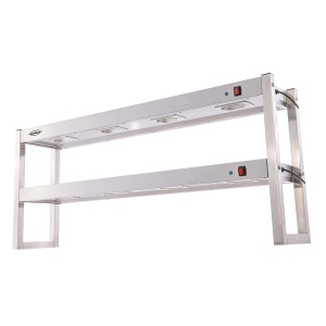 Deze demontabele étagère is de perfecte oplossing voor het presenteren en warmhouden van je lekkernijen in elke professionele setting. Met twee niveaus en twee lampen per niveau biedt deze étagère een gelijkmatige en efficiënte verwarming, waardoor gerechten op de juiste temperatuur blijven. Het temperatuurbereik van 60-70 graden zorgt ervoor dat je voedsel op de ideale temperatuur wordt gehouden, zonder in te boeten op smaak en kwaliteit. Met de twee stekkers is het apparaat eenvoudig aan te sluiten en te gebruiken. De afmetingen zijn 1500x300x650 mm (LxDxH) – verbruik 2.4 kW – temp. +60/+70ºC – gewicht 19 kg.