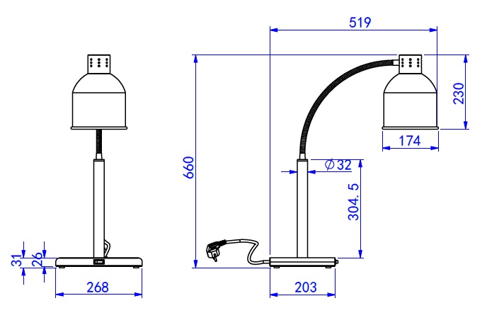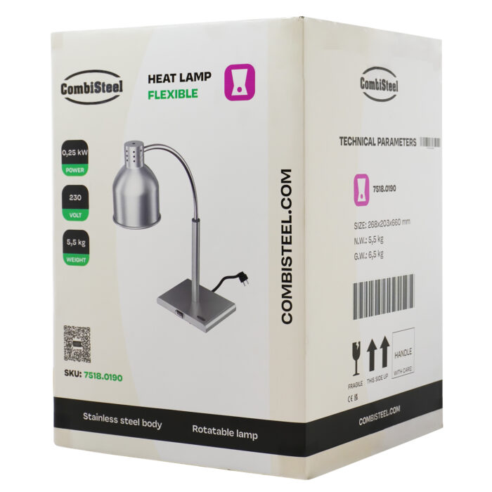 Maak kennis met onze warmhoudlamp, een essentiële aanvulling voor elke professionele keuken en cateringomgeving. Deze compacte en robuuste lamp is vervaardigd uit ijzer, wat zorgt voor duurzaamheid en een stabiele constructie. Dankzij de krachtige lamp biedt deze lamp een efficiënte warmteverdeling, perfect voor het behouden van de optimale serveertemperatuur van voorgerechten tot desserts, terwijl de versheid en smaak behouden blijven. De afmetingen zijn 268x203x660mm (LxBxH) – verbruik 0.25 kW – gewicht 5.5 kg.