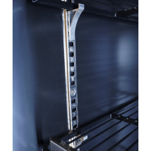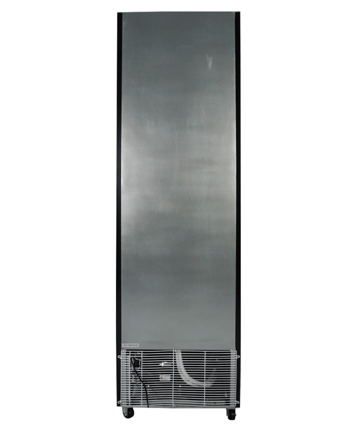 Deze zwarte koelkast heeft een moderne uitstraling, zelf sluitende deur, verstelbare schappen en digitale temperatuur aflezing. Het geventileerde koelsysteem zorgt voor efficiënte koeling, terwijl automatische ontdooiing het onderhoud minimaliseert. De LED-verlichting verlicht je producten optimaal en de deurverwarming voorkomt condensvorming, eenvoudig in- of uit te schakelen. De afmetingen zijn 620x705x2050mm (LxDxH) – verbruik 0.3 kW – inhoud 450 liter – temp. 0/+10ºC – gewicht 105 kg.