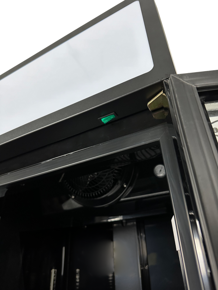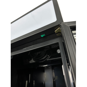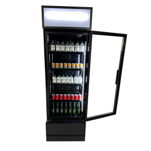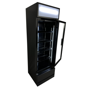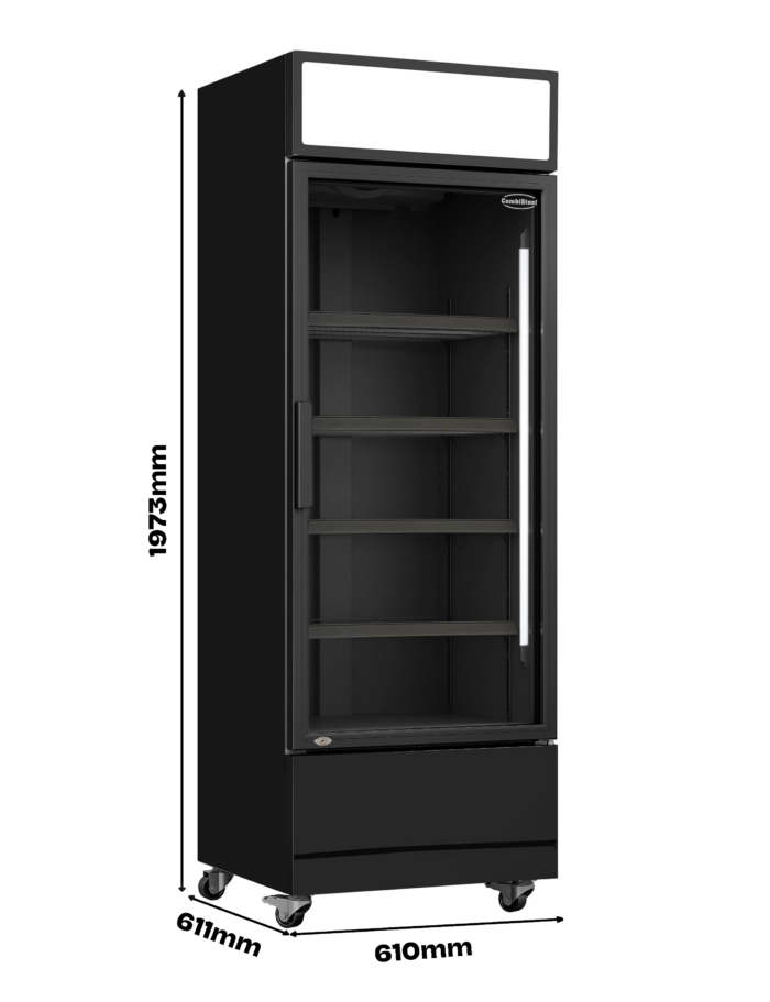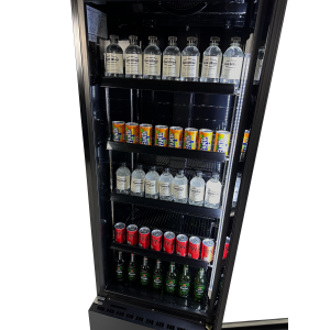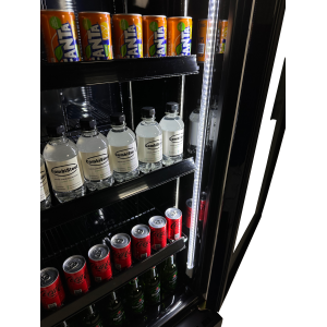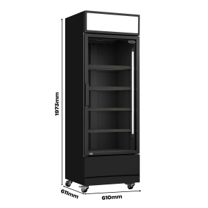 Deze zwarte glasdeurkoelkast met 1 glasdeur is ideaal voor elke professionele horecagelegenheid, maar ook voor semi-professioneel of thuisgebruik. Met zijn moderne zwarte ontwerp is deze koelkast niet alleen praktisch, maar ook een stijlvolle toevoeging aan je interieur. Dankzij het geventileerde koelsysteem worden je dranken altijd gelijkmatig gekoeld. De automatische ontdooiing bespaart je tijd en moeite, terwijl de ingebouwde LED-verlichting je producten perfect uitlicht. De afmetingen zijn 610x610x1973 mm (LxDxH) – verbruik 0.285 kW – inhoud 360 liter – temp. +1/+10ºC – gewicht 72 kg.