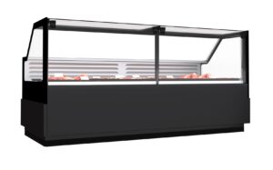 Deze zwarte koelvitrine met plaatkoeling is ideaal voor winkels, slagerijen, bakkerijen en horeca waar een aantrekkelijke en constante presentatie van producten essentieel is. Dankzij de geavanceerde plaatkoeling blijven producten snel en gelijkmatig op de ideale temperatuur van -1/+7 ºC, terwijl condensvorming tot een minimum wordt beperkt. De digitale regelaar en LED-verlichting zorgen voor een energiezuinige en overzichtelijke etalage. Afmetingen: 2870x1095x1250 mm (LxBxH) – Verbruik: 2,5 kW – Temperatuur: -1/+7 ºC – Inhoud: 1199 liter – Etaleeroppervlakte: 2,02 m² – Gewicht: 407 kg.