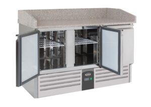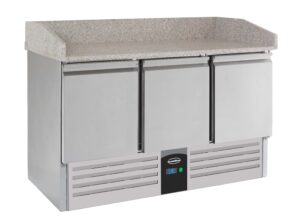 Deze professionele pizzawerkbank met 3 deuren combineert gekoelde opslag en werkruimte in één handig apparaat. Het werkblad van graniet is perfect om deeg op uit te rollen: glad, hygiënisch en bestand tegen intensief dagelijks gebruik. Onder het werkblad bevinden zich drie ruime koelcompartimenten voor het efficiënt bewaren van ingrediënten, deegbollen en sauzen. Afmetingen 1400x700x1020 mm (BxDxH) – vermogen 0,34 kW – temperatuurbereik +2/+8 °C – inhoud 230 liter – gewicht 95 kg – geschikt voor 3x GN 1/1