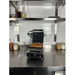 Breng creativiteit naar je keuken of horecazaak met dit wafelijzer dat heerlijke wafels in de vorm van een dennenboom bakt. Perfect voor feestelijke gelegenheden, originele traktaties, of een speelse toevoeging aan je menu. Dankzij het stijlvolle en praktische ontwerp wordt wafels bakken een feestelijke ervaring. De afmetingen zijn 305x430x505 mm (LxDxH) – vermogen 1.75 kW – gewicht 12 kg.