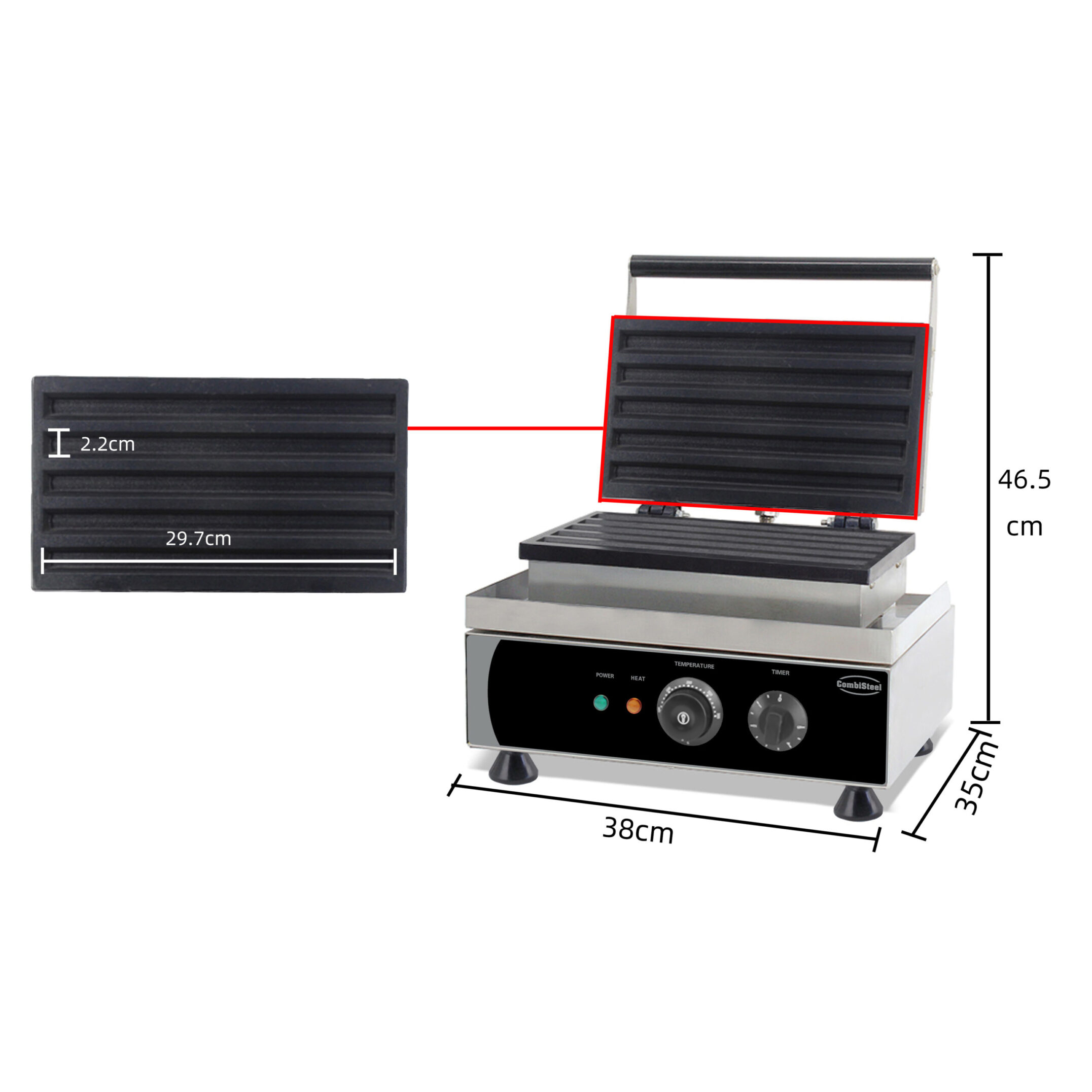 Breng de onweerstaanbare smaak van churros naar je keuken of horecazaak in een verrassend nieuwe vorm. Dit wafelijzer bakt heerlijke churros-wafels: krokant van buiten, luchtig van binnen, en perfect om te dippen in chocolade of andere toppings. Ideaal voor ontbijt, dessert, of een unieke snack! Dankzij het handige ontwerp bak je snel en eenvoudig 5 churros-wafels tegelijk. De afmetingen zijn 380x350x465 mm (LxDxH) – vermogen 1.75 kW – gewicht 12 kg.