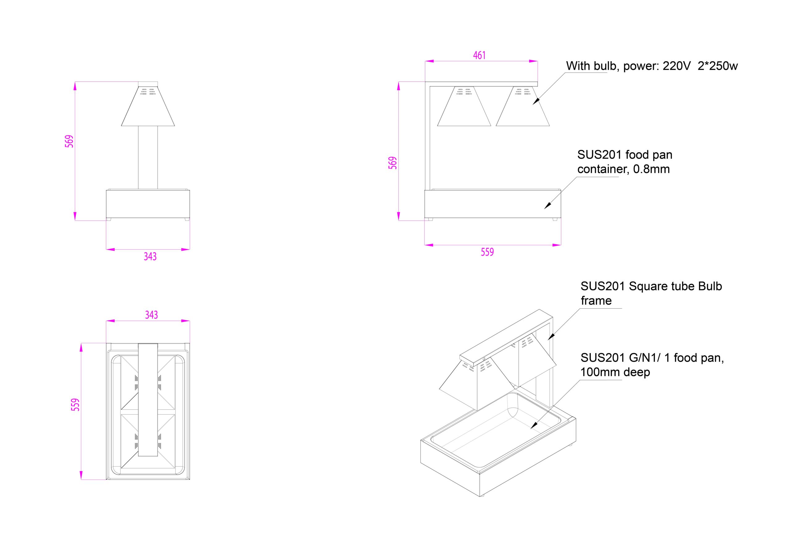 Deze professionele warmhoudlamp met 2 lampen is ontworpen om bereide gerechten gelijkmatig op de juiste serveertemperatuur te houden, zonder deze verder te verhitten. De robuuste RVS constructie maakt dit model ideaal voor intensief gebruik in o.a. fastfoodrestaurants, cafetaria’s, foodtrucks en hotels. Het artikel is demontabel uitgevoerd, wat zorgt voor eenvoudig transport en opslag. De afmetingen zijn 343x559x569 mm (LxDxH) – verbruik 0,5 kW – gewicht 8,3 kg.